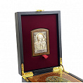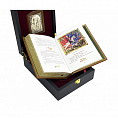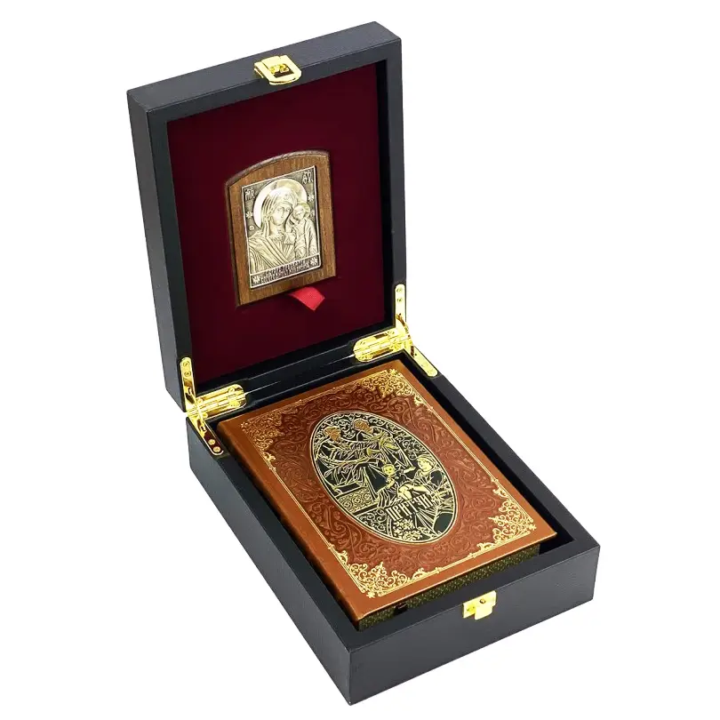 Оригинальный подарочный набор включает в себя книгу в кожаном переплете «Притчи» и икону «Казанской Божией Матери», оформленных в деревянной коробке, обтянутой кожей.
