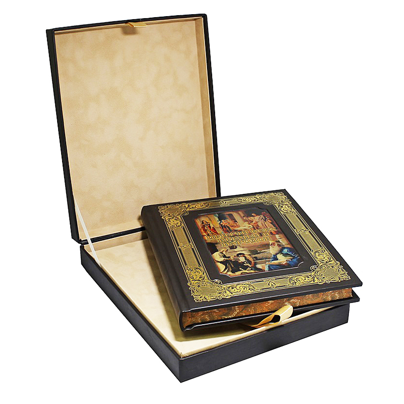 Издание представлено в оригинальной подарочной коробке. Дизайн прекрасно сочетает в себе золотое тиснение и художественную металлическую вставку, соответствующую тематике издания, а также крашенный в тон переплетного материала обрез. Цельнокожаный переплет ручной работы. Высококачественная бумага, красочные иллюстрации, ляссе.