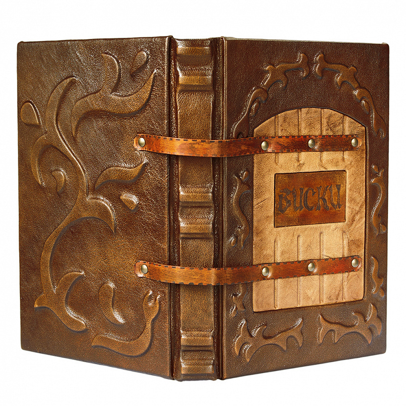 Материалы: два вида кожи разной выделки, тиснение, фурнитура под бронзу, гальванопластика, прокрашенный обрез, латунь