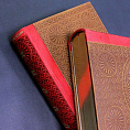 Переплет из шелка SAVANNA с блинтовым тиснением и тиснением золотой фольгой; верхний обрез книги украшен золочением.