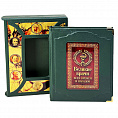 Книга представлена в оригинальном подарочном коробе, сделанном из мдф и обтянутым вручную высококачественной натуральной кожей. Цельнокожаный переплёт ручной работы, украшен иллюстрированной вставкой из цветного металла. Обложка двухуровневая. Металлические уголки дополняют дизайн и сохраняют книгу при использовании. Текст книги напечатан на мелованной бумаге и дополнен цветными иллюстрациями. Обрез оформлен художественным изображением. Ляссе из шёлковой ленты. Форзац цельный из дизайнерской бумаги.