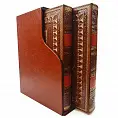 Переплет ручной работы выполнен по технологиям XIX века из высококачественной переплетной кожи натурального дубления. По всему периметру книг выполнено блинтовое тиснение, конгревное объемное 3D тиснение, а также тиснение «золотой» фольгой. На лицевой стороне книги украшены металлическими барельефами, которые выполнены по уникальной технологии объемного 3D тиснения с максимальной детализацией.