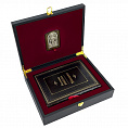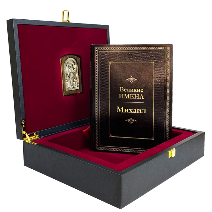 Оригинальный подарочный набор включает в себя книгу в кожаном переплете из серии «Великие имена» и икону «Ангел-Хранитель», оформленных в деревянной коробке, обтянутой кожей. В данном наборе может быть вложена любая книга из 14-ти имен: