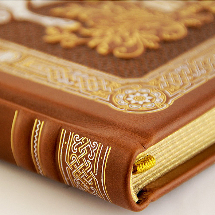 Переплёт ручной работы из натуральной кожи. Форзац из дизайнерской бумаги. 4 бинта на корешке, ручной обработки. Каптал золотой из натуральной кожи. Обрез блока торшонированный золотой. Тиснение блинтовое и золотой фольгой. Ляссе.