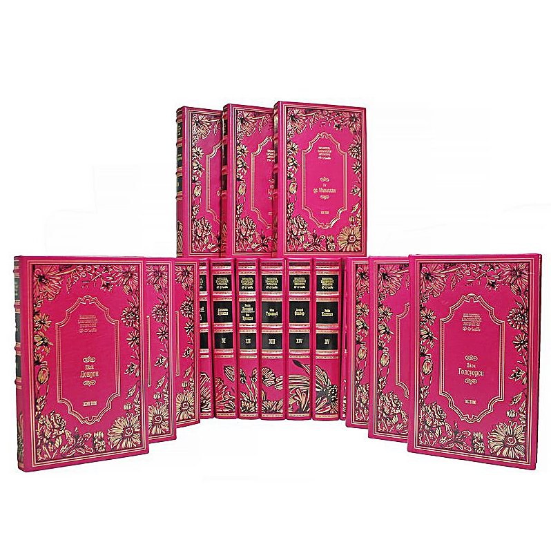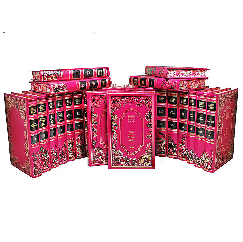 Каждая книга данного 25-титомного собрания представлена в цельнокожаном переплете ручной работы. Оригинальный дизайн включает в себе сочетание блинтового, золотого и цветного тиснения выполненных на высококачественной натуральной коже. Уникально иллюстрированный обрез. Богато оформленные дюблюрами оригинальные «бархатные» форзацы. Ляссе.