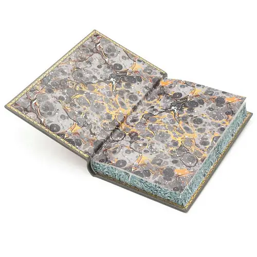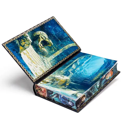 Переплет ручной работы из натуральной кожи Составной футляр ручной работы: искусственная кожа, дизайнерская бумага Цветные трехсложные иллюстрации с вырубкой Бумага Olin Regular (Франция) Шелковые каптал и ляссе, форзацы украшены дизайнерской бумагой с авторским рисунком, переплет украшен тиснением серебряной и пигментной фольгой, на крышке вклейка в виде замочной скважины.