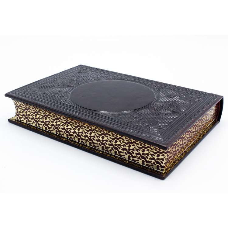 Исторический французский стиль кожаного переплета, уникальное тиснение, рельефное, блинтовое и цветное. Обрезы книжного блока тонированы с нанесением орнамента, страницы книг имеют тематическое оформление и иллюстрации, отпечатаны на высококачественной немецкой бумаге.