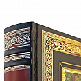 Переплёт ручной работы из натуральной кожи. Форзац из дизайнерской бумаги. 4 бинта на корешке, ручной обработки. Каптал золотой из натуральной кожи. Обрез блока торшонированный золотой. Тиснение блинтовое и золотой фольгой. Ляссе.