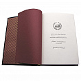 Классический европейский переплёт ручной работы из натуральной кожи. Форзац из дизайнерской бумаги Malmero с тиснением орнамента золотой фольгой. 6 бинтов на корешке, ручной обработки. Каптал золотой из натуральной кожи. Обрез блока – золото с торшонированием. Тиснение блинтовое, золотой и цветной фольгой. Ляссе.
