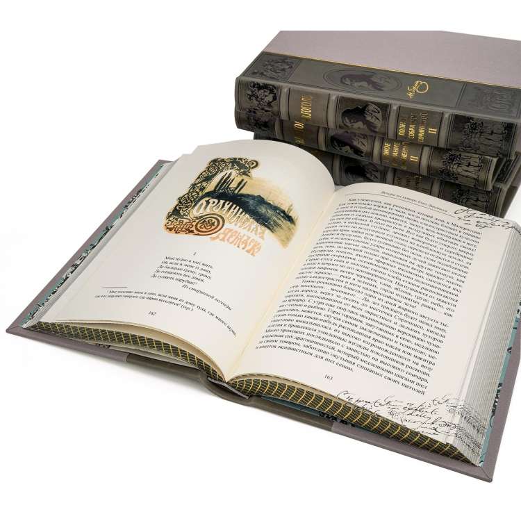 Богато оформленное собрание, представлено в подарочном издании. Цельнокожаный переплёт из натуральной шагрени, ручной работы, украшен цветной кожаной вставкой, а также серебряным и золотым тиснением. На обложке изображён портрет автора, а узнаваемые сюжеты и образы дополняют дизайн. Корешок декорирован бинтами. Текст книги напечатан на офсетной бумаге и дополнен чёрно-белыми иллюстрациями. . Обрез оформлен в технике "Перо павлина". Ляссе из шёлковой ленты. Форзац цельный из дизайнерской бумаги. Дублюра окатана золотом.В комплект входят перчатки и, по желанию, сертификат, который может быть именным. Цветовое сочетание переплёта и упаковки может отличаться от представленных на фото.
