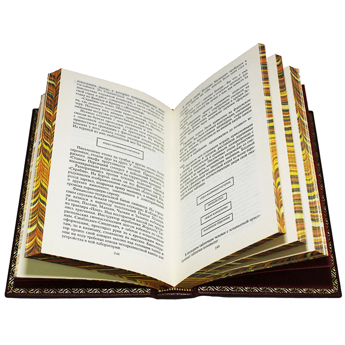 Букинистическое издание представлено в цельнокожаном переплете ручной работы. Оригинальный дизайн сочетает с себе золотое и цветное тиснение, крашенный в тон переплетного материала обрез, дублюры.