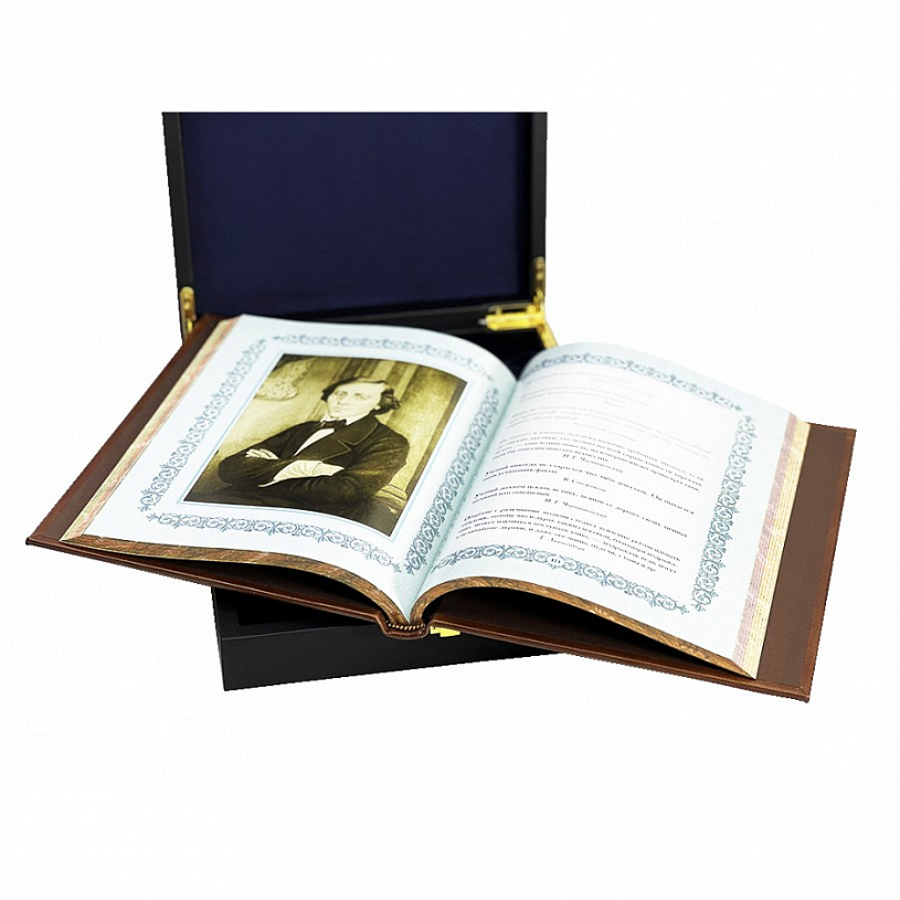 Издание представлено в оригинальной подарочной коробке. Дизайн прекрасно сочетает в себе золотое и блинтовое тиснение, художественную металлическую вставку, соответствующую тематике издания, а также крашенный в тон переплетного материала обрез. Цельнокожаный переплет ручной работы. Высококачественная бумага, красочные иллюстрации, ляссе.