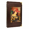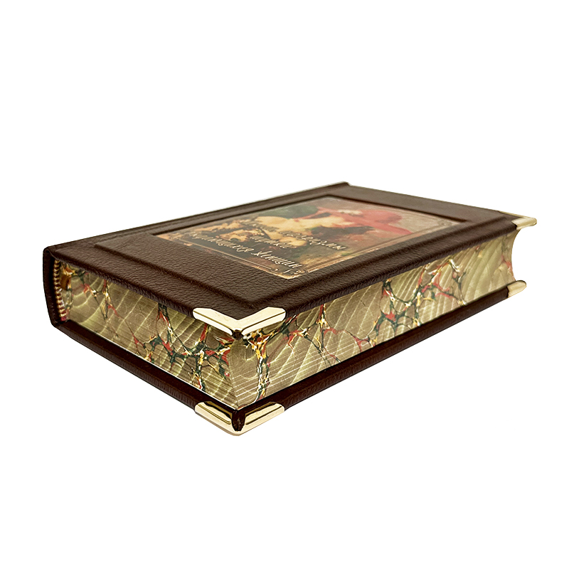 Дизайн прекрасно сочетает в себе бинтовое тиснение, художественную металлическую вставку, соответствующую тематике издания, а также крашенный в тон переплетного материала обрез. Цельнокожаный переплет ручной работы