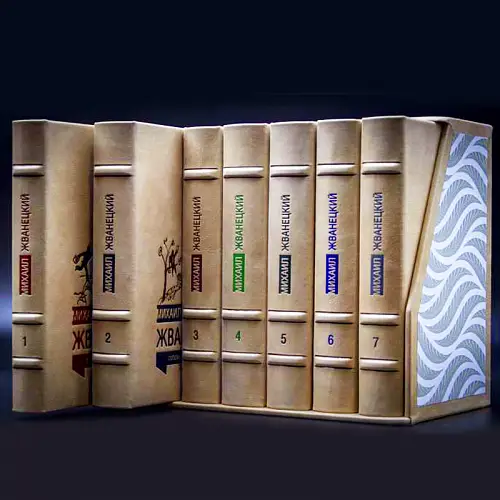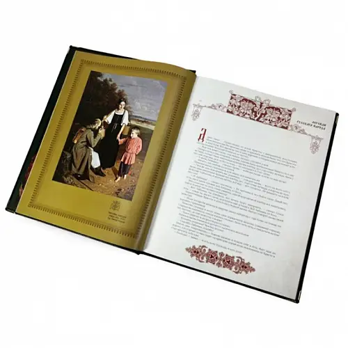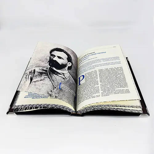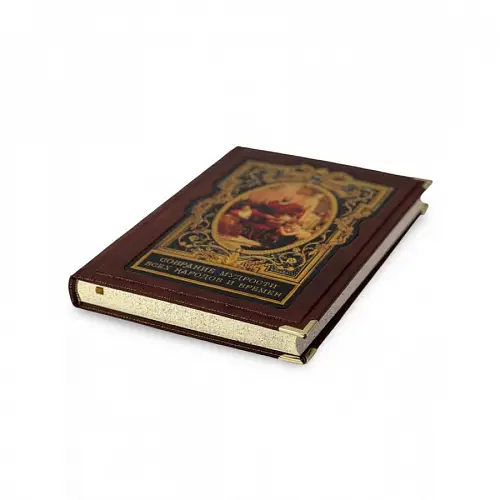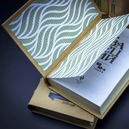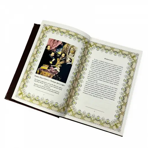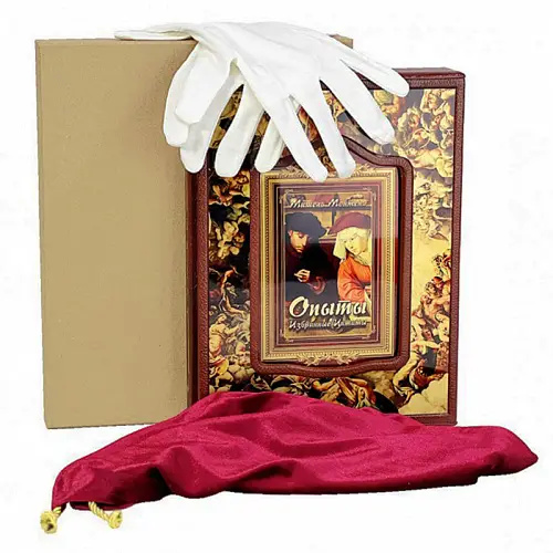 Классический европейский переплёт ручной работы из натуральной кожи. Форзац из дизайнерской бумаги Malmero с тиснением орнамента золотой фольгой. 6 бинтов на корешке, ручной обработки. Каптал золотой из натуральной кожи. Обрез блока – золото с торшонированием. Тиснение блинтовое, золотой и цветной фольгой. Ляссе.