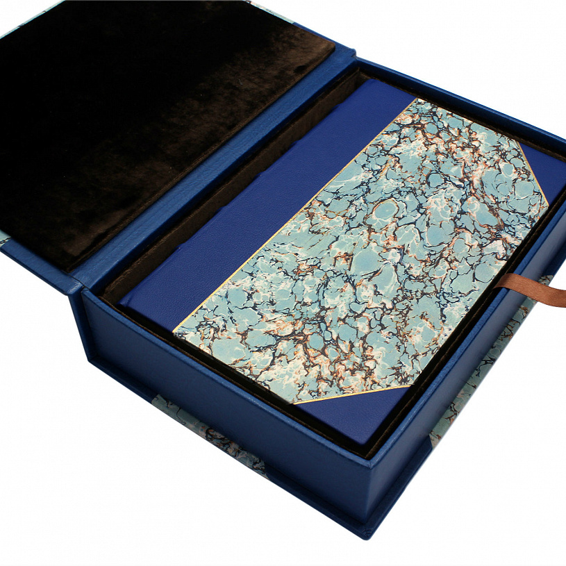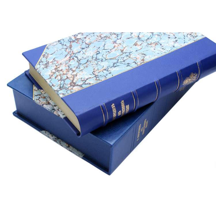 Кожаный переплёт. Натуральная кожа. Переплет- составной французский с использованием мраморной бумаги ручной работы. Золотое тиснение и бинты на корешке. Ручная окатка золотом. Блок и обрез книги состарен. В комплекте подарочный футляр в аналогичном исполнении.