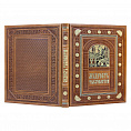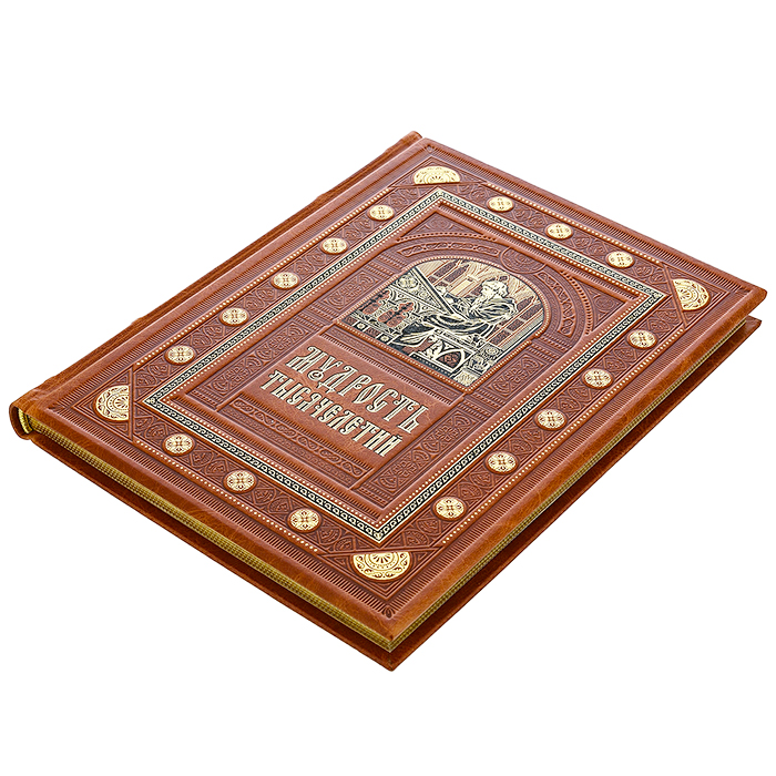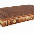 Переплёт ручной работы из натуральной кожи. Форзац из дизайнерской бумаги. 4 бинта на корешке, ручной обработки. Каптал золотой из натуральной кожи. Обрез блока торшонированный золотой. Тиснение блинтовое и золотой фольгой. Ляссе.