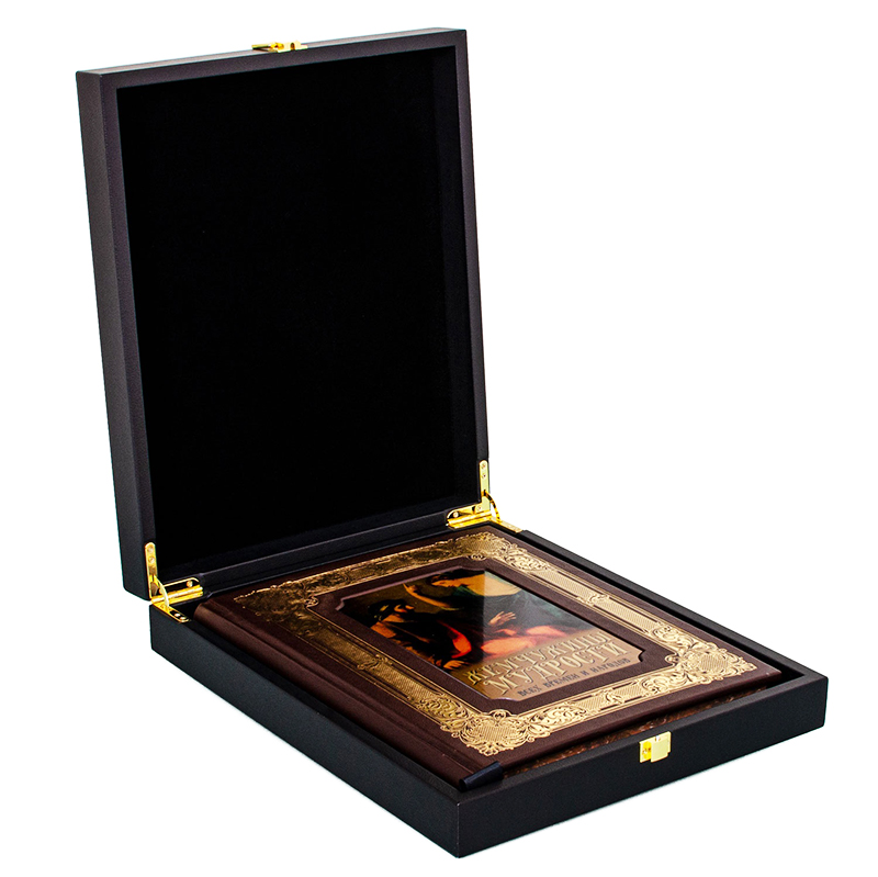 Дизайн прекрасно сочетает в себе золотое и блинтовое тиснение, художественную металлическую вставку, соответствующую тематике издания, а также крашенный в тон переплетного материала обрез. Цельнокожаный переплет ручной работы. Высококачественная бумага, красочные иллюстрации, ляссе.