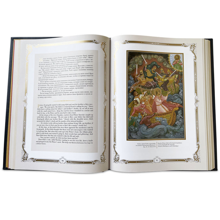 Издание иллюстрировано палехскими миниатюрами наиболее почитаемых Русской Православной Церковью святых – равноапостольской княгини Ольги и великого князя Владимира, преподобного Сергия Радонежского, благоверных князей Александра Невского и Дмитрия Донского, блаженной Матроны Московской, Патриархов Московских и всея России Гермогена и Тихона и многих других. Рассказ об их жизни, духовном подвиге и деяниях, раскрывает самые яркие, героические и трагические страницы истории в сопровождении текстов на русском и английском языках.