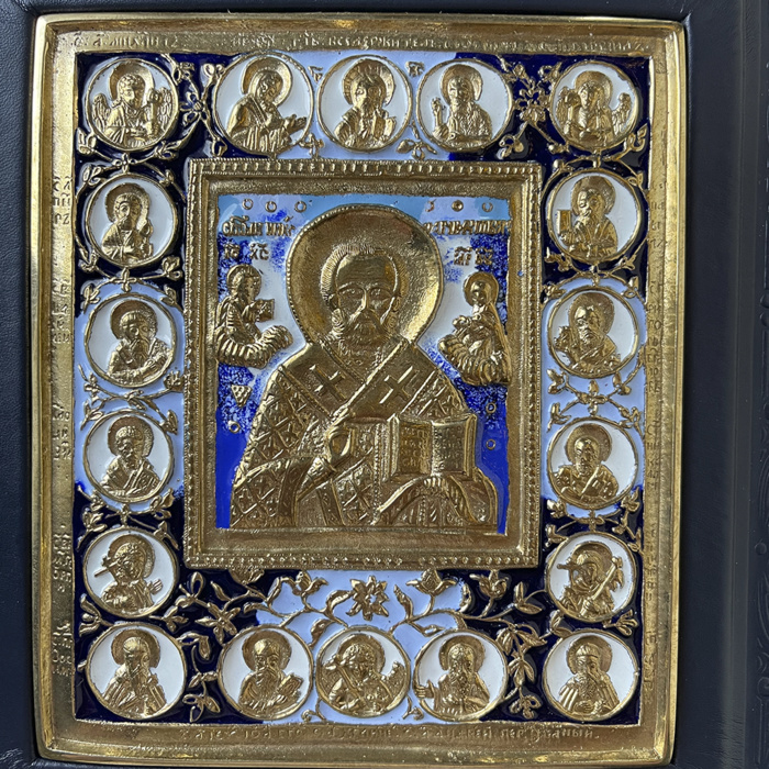 натуральная кожа, художественное литье ручной работы, расписанное вручную цветными эмалями с изображением русских святых