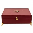 Деревянный ларец обтянут экокожей кона. Декорирован бронзовыми ножками, боковыми ручками, петлями и замком.