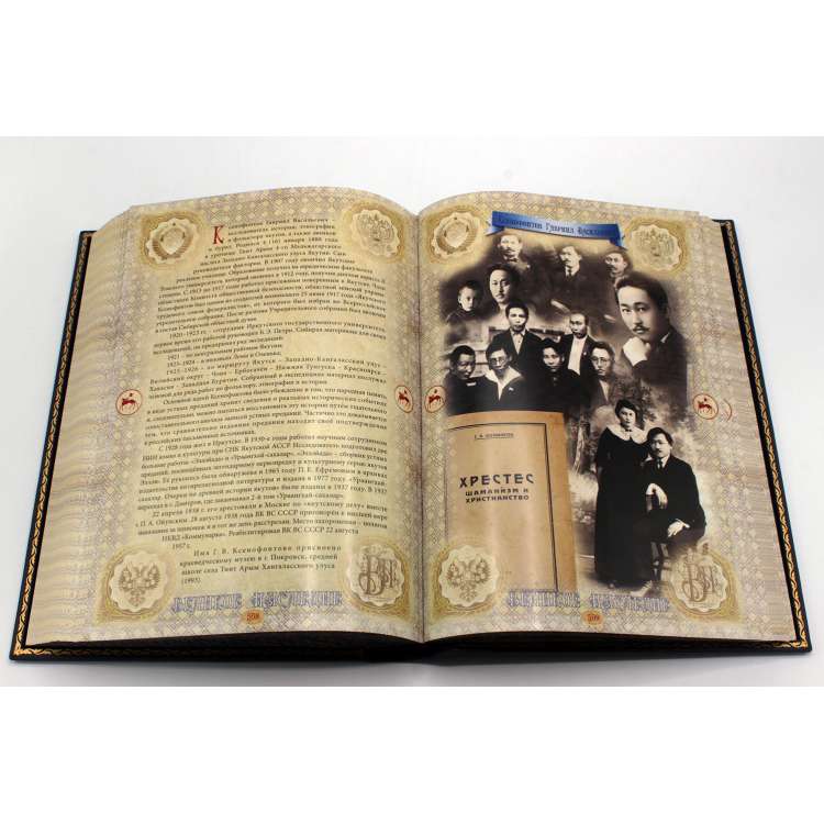 Книга в кожаном переплете "Республика Саха, Якутия" представляет собой уникальное издание, посвященное богатой культуре, природе и истории якутского края. Изданная в качестве роскошного альбома, она сочетает в себе высокое качество бумаги, изысканный дизайн и множество красочных иллюстраций, что делает её настоящим украшением любой библиотеки.