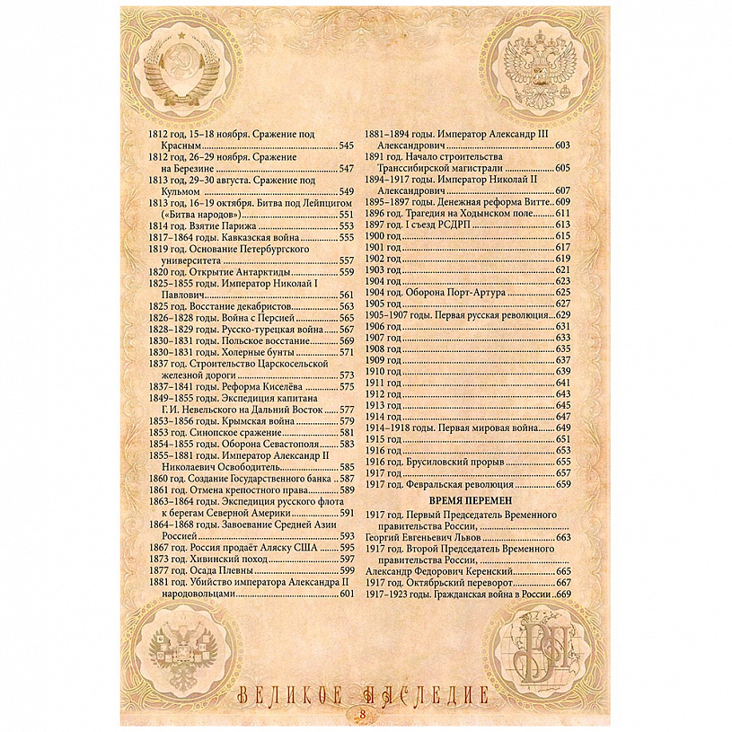 Книга представляет собой краткое изложение важнейших периодов Российской истории с древнейших времён до наших дней. В издании описаны и проиллюстрированы события, происходившие во времена правления всех государственных лидеров нашей страны на всём протяжении становления отечественной государственности.