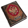 Книга выполнена в строгом классическом исполнении. Для твердого переплета применены две отделки кожи. Бежевая жатая структура придает 3D эффект. Классическая коричневая натуральная кожа дополнена тиснениями, гальванопластикой в виде герба на красном фоне.