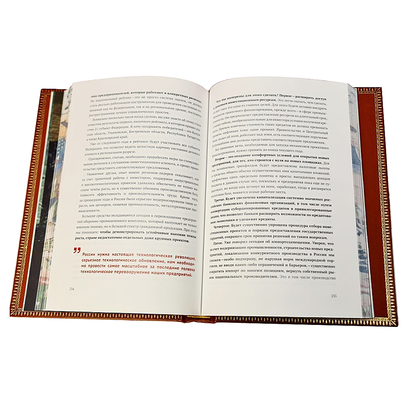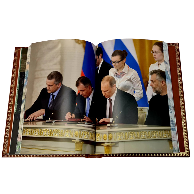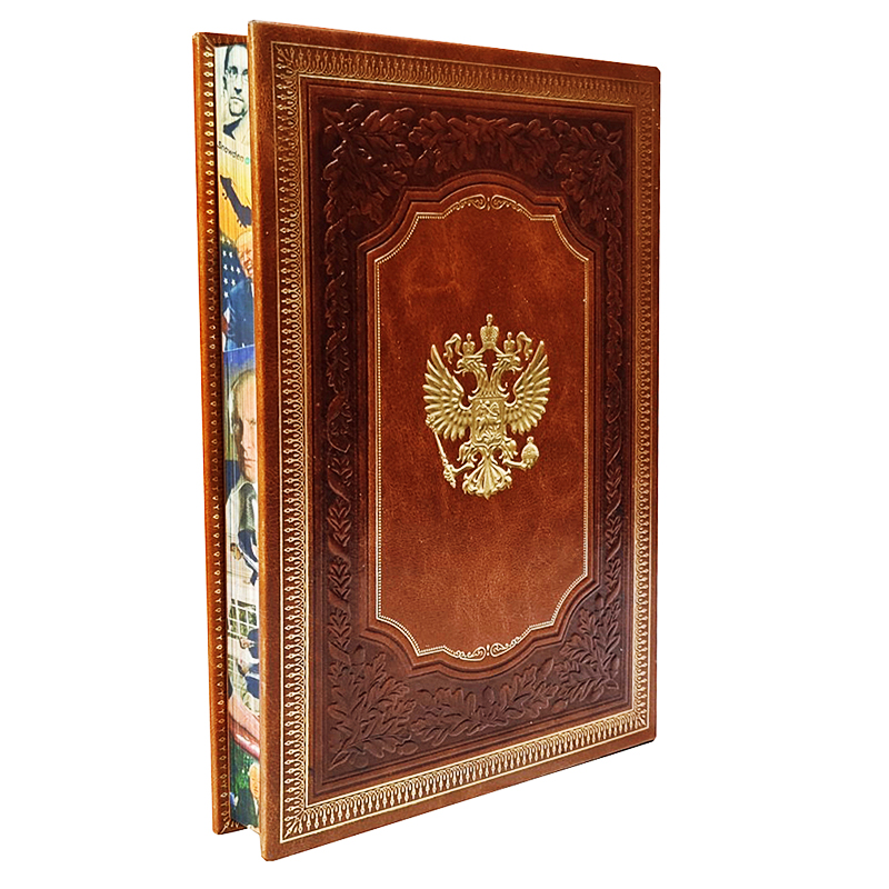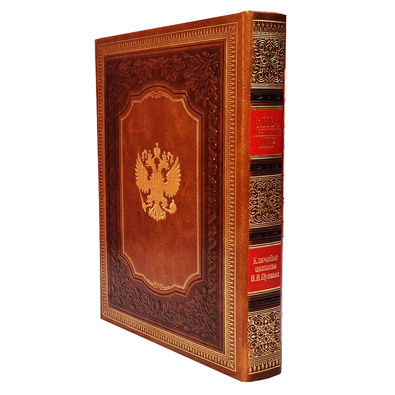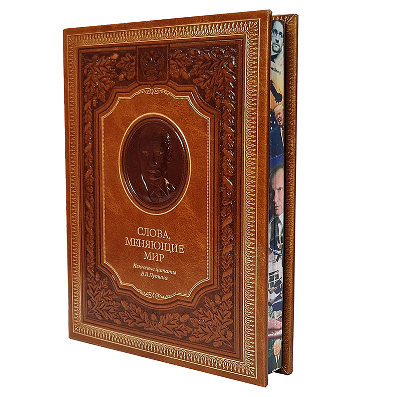 Переплет ручной работы выполнен по технологиям XIX века из высококачественной переплетной кожи КРС натурального дубления. По всему периметру книги выполнено блинтовое тиснение, конгревное объемное тиснение, а также тиснение «золотой» фольгой. На лицевой стороне книга украшена конгревным барельефом В.В. Путина, который выполнен по уникальной технологии объемного 3D тиснения с максимальной детализацией.