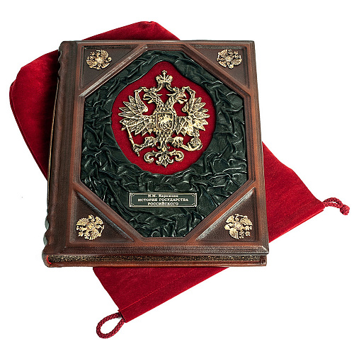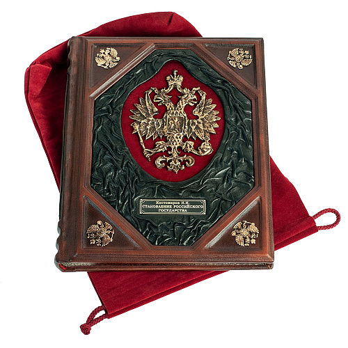 Стильный кожаный переплёт ручной работы, золотое тиснение, трёхсторонний обрез окрашен вручную. Фигурная вырубка в виде герба РФ. Форзац – декоративная дизайнерская бумага с тиснением. Каптал и лессе шёлковые. Подарочный футляр.