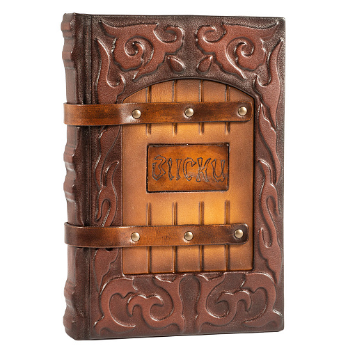 Кожаный тисненый переплет ручной работы с художественными вставками, металлические уголки. Исполнение в оригинальной кожаной подарочной коробке с художественными накладками.
