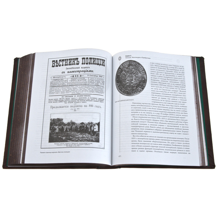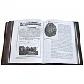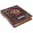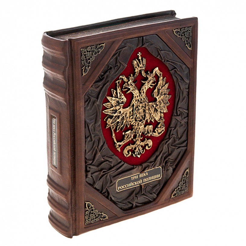 Книга выполнена в строгом классическом исполнении. Для твердого переплета применены две отделки кожи. Бежевая жатая структура придает 3D эффект. Классическая коричневая натуральная кожа дополнена тиснениями, гальванопластикой в виде герба на красном фоне.