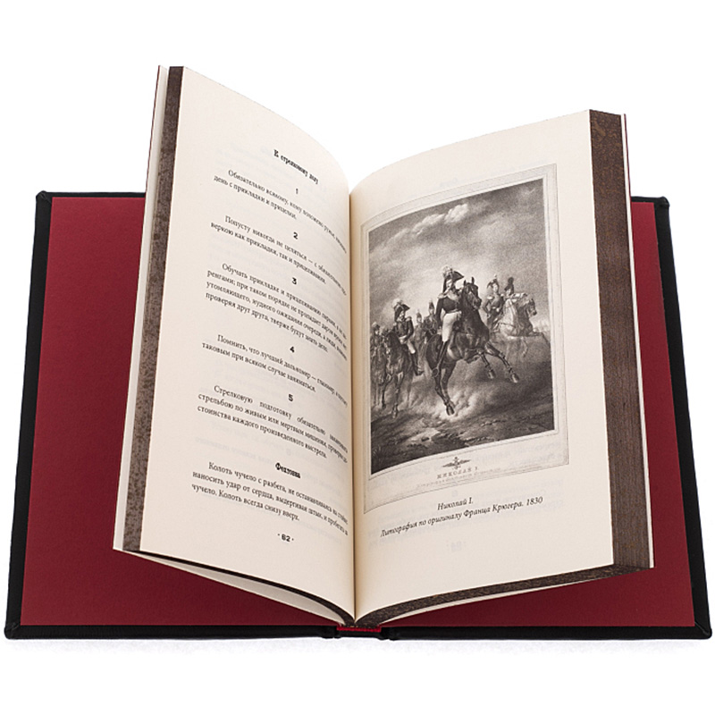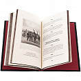 Подарочная книга "Кодекс чести русского офицера" изготовлена в твердом переплете, выполненном из натуральной кожи. Отличная выделка подчеркивает изысканность издания. На фоне из красного бархата размещен герб. Тиснение и вензеля по углам обложки придают книге дорогой вид. Обрез страниц покрашен вручную в темный цвет с золотым напылением.