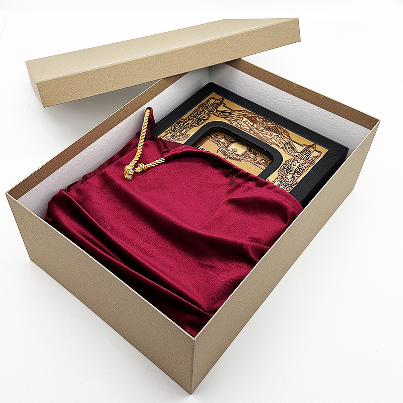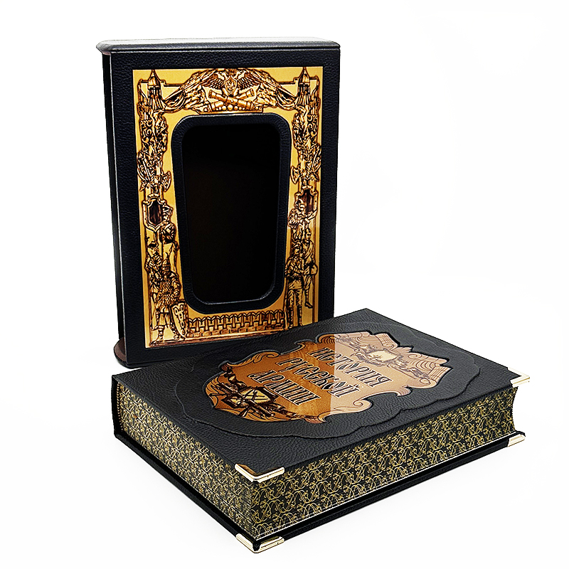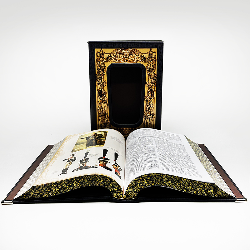 Цельнокожаный переплёт ручной работы, украшен иллюстрированной вставкой из цветного металла и золотым тиснением. Текст книги напечатан на глянцевой бумаге и дополнен цветными иллюстрациями. Обрез оформлен в технике "Перо павлина". Ляссе из шёлковой ленты. Форзац цельный из дизайнерской бумаги. Футляр кожаный, вдохновлён дизайном книги.