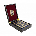 Оригинальный подарочный набор включает в себя книгу в кожаном переплете «Кодекс чести русского офицера» и икону «Св. Георгий Победоносец», оформленных в деревянной коробке, обтянутой кожей.