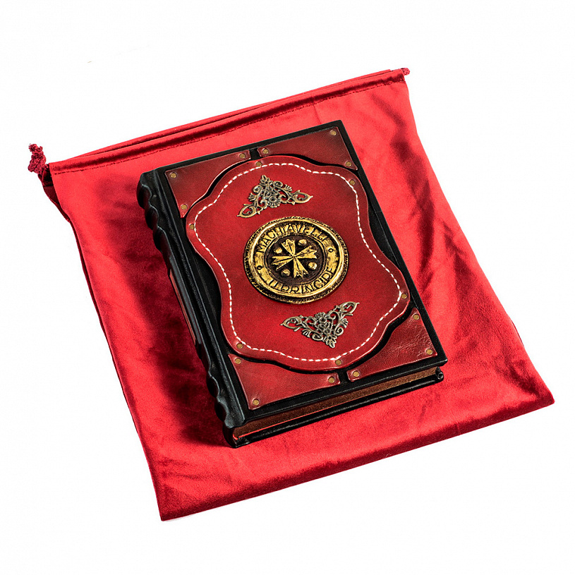 В оформлении книги переплетены три вида кожи, различные техники по ее обработке: тиснение, пирография (выжигание по коже). Бронзовые заклепки и уголки из гальванопластики делают книгу Н. Макиавелли “Государь” царским подарком для тех, кто мечтает управлять людьми, менеджерам среднего звена, государственным деятелям, депутатам. Обрез окрашен золотым цветом. Стилизованный щит на обложке прошит контрастными нитками вручную.