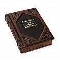 Переплет выполнен из натуральной кожи двух цветов. Строгий дизайн обложки украшен тиснением, фурнитурой под бронзу. Золотые буквы заголовка книги и имя автора расположены по центру обложки на черной табличке. Корешок также богато украшен тиснением и золотыми названием книги. Обрез книги прокрашен вручную, на нем создан уникальный рисунок из золотых капель на темном фоне.