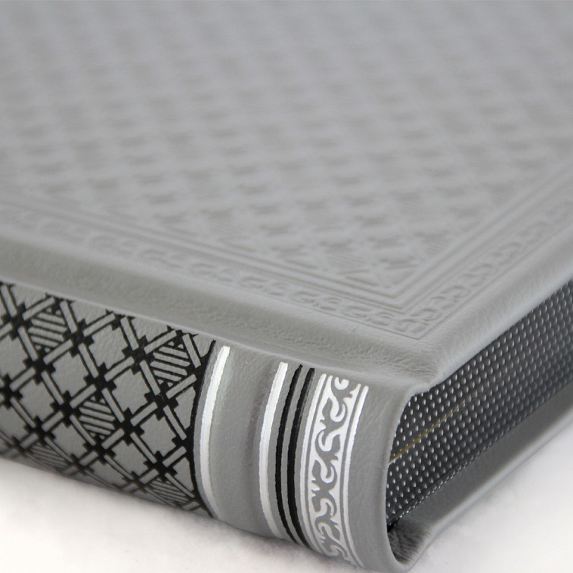 Переплёт ручной работы из натуральной кожи. Форзац из дизайнерской бумаги. 4 бинта на корешке, ручной обработки. Обрез блока торшонированное золото. Тиснение блинтовое, золотой и цветной фольгой. Каптал из натуральной кожи. Ляссе.