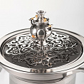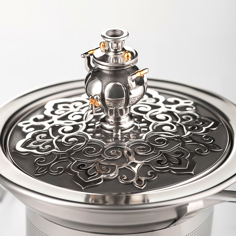 Заварочный чайник посвящен красоте и разнообразию русских деревянных оконных наличников. Сосуд изготовлен из боросиликатного стекла, что кроме термостойкости придает ему особый блеск и устойчивость к царапинам. Ручка термически изолирована. Съемный фильтр легко промывается.