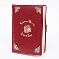 Обложка — экокожа «Небраска» красного цвета. Отстрочка по периметру. Петля для крепления ручки. Цветное изображение методом УФ-печати.