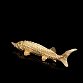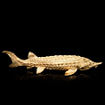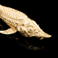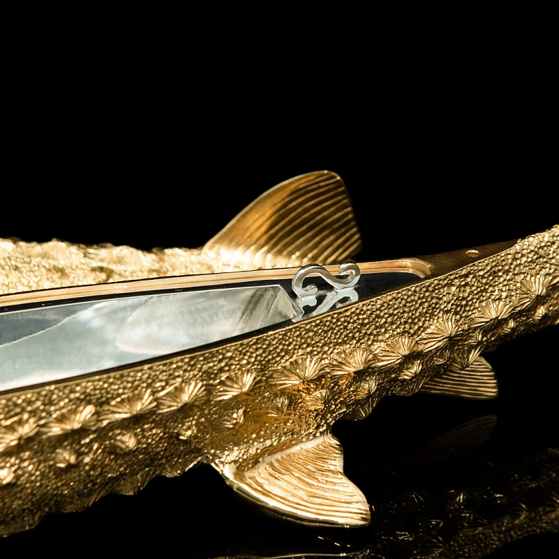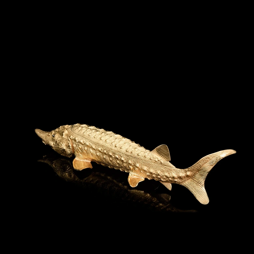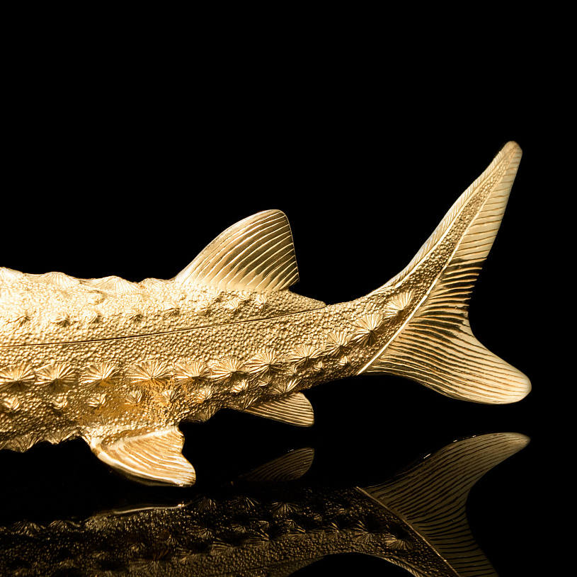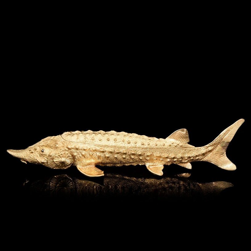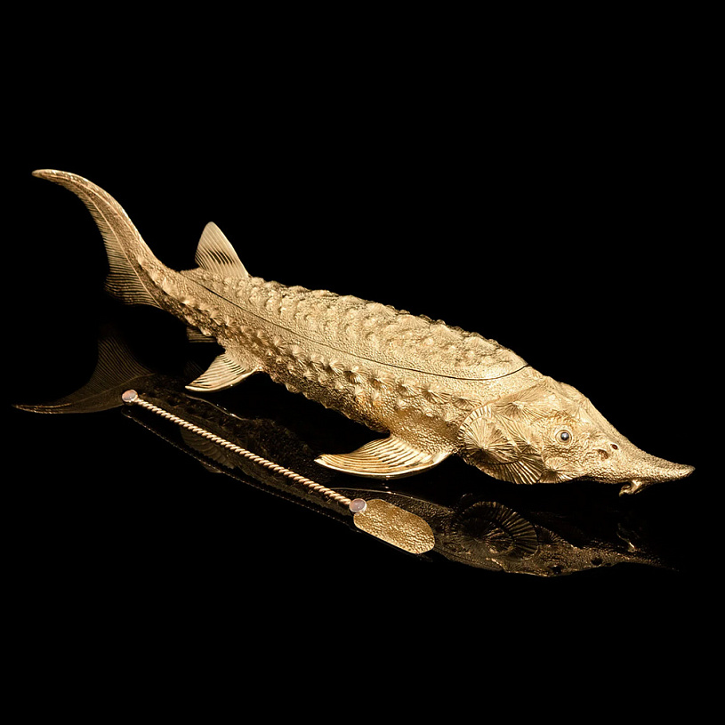 Оригинальная икорница «Осетр» из латуни с полным покрытием 24-каратным золотом выполнена по мотивам работ 19 века известного российского ювелира Карла Фаберже. В качестве ключевого образа выбран знаменитый русский осётр — символ царственности и благородства. Крупная икорница из серебра имеет общую длину 450 мм.