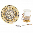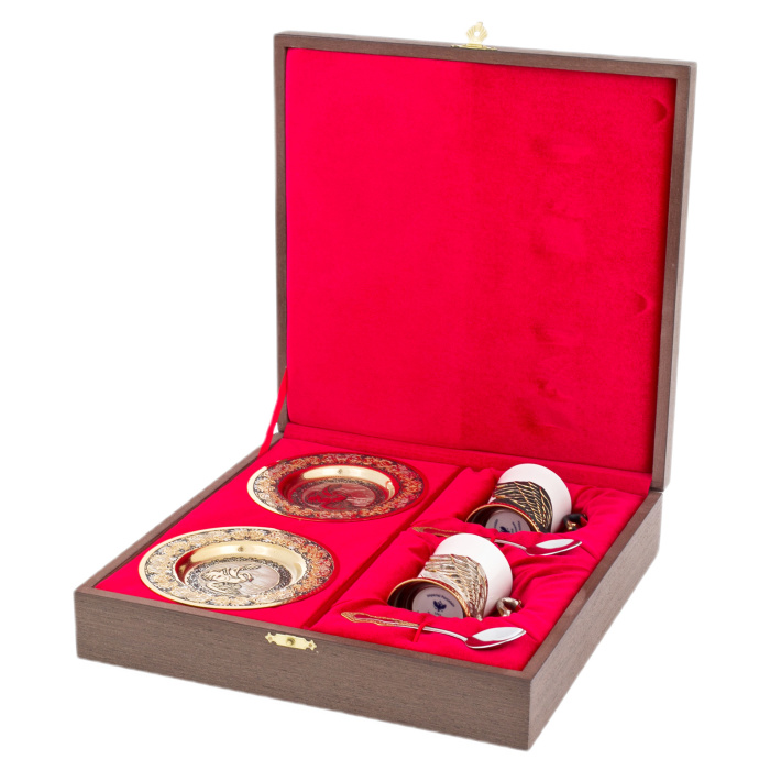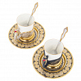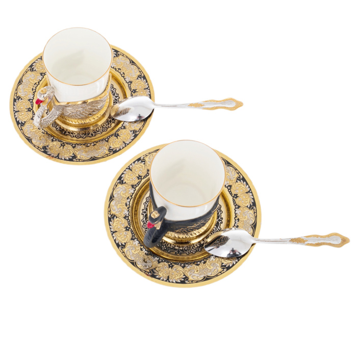 Набор для кофе из двух чашек в стиле Златоуста представляет собой элегантный и роскошный комплект посуды, который идеально подойдет для сервировки кофейного стола. Чашки украшены изысканным золотым узором, выполненным в традиционном стиле Златоуста - известного русского центра художественной ковки.