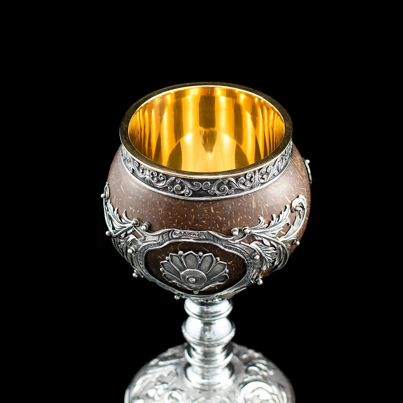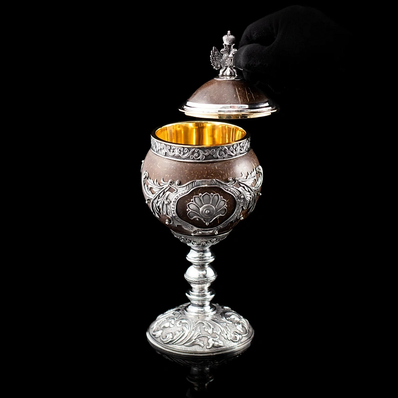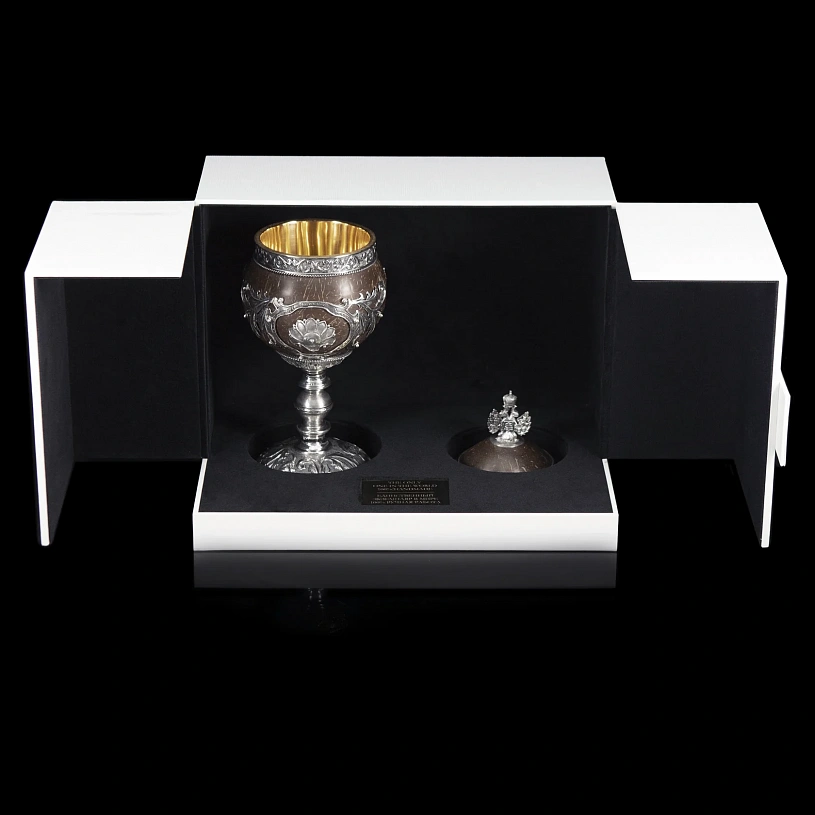 Верхняя часть кубка сделана съемной, в виде крышки, украшенной объемным серебряным гербом Российской Федерации. Крышка открывает доступ к емкости, покрытой золотом 24 карата. Кокос по периметру украшен резными серебряными элементами ручной работы.