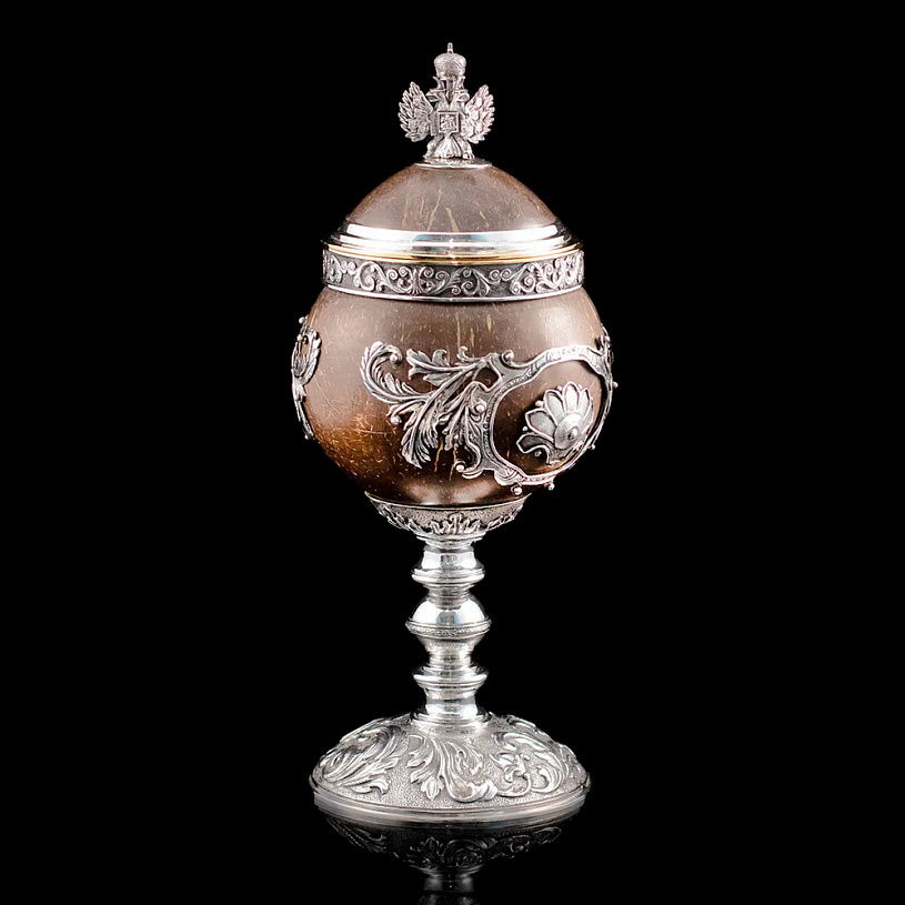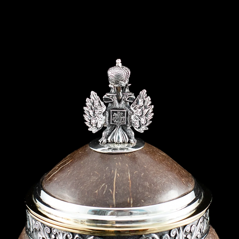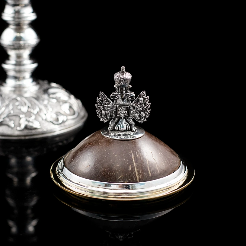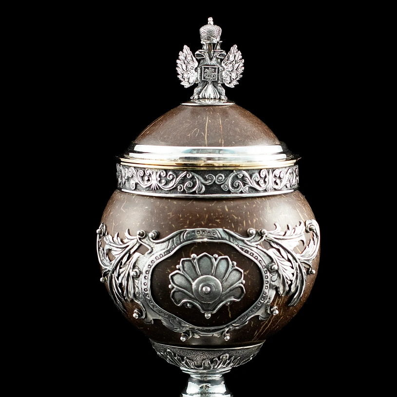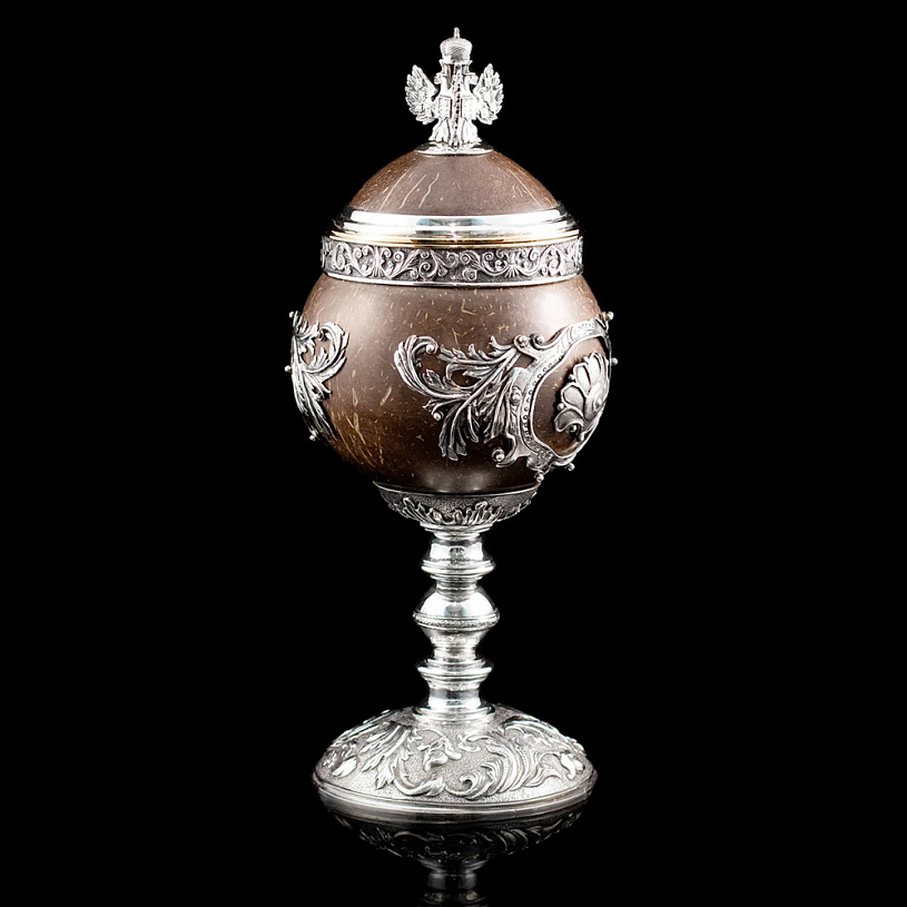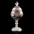 Оригинальный кубок «Россия» в стилистике работ Фаберже выполнен из серебра 925 пробы в сочетании с натуральным полированным кокосовым орехом.