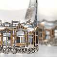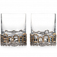 Набор стаканов для виски изготовлен из премиального стекла с серебром. Работа посвящена красоте и разнообразию деревянных оконных наличников. Резные шедевры в русских домах всегда были не только эстетическим элементом, но и оберегом, который был призван защищать жилище от «дурного глаза». Оформление окна здания — своеобразная картина мира. В верхней части небо, которое в славянских поверьях было 2-х уровневым: «нижнее небо» называли «небесными хлябями», а верхнее – «небесной твердью». Небесная хлябь – символ плодородия и живительной влаги — изображается как волнистая линия или отчетливые полукружья и могла «стекать» по краям окна, изображаясь в виде капелек. Нижняя часть деревянного наличника должна была символизировать «твердь земную», а поэтому часто имела изображения вспаханного и засеянного поля (ромбы с точками внутри и двойные перекрещивающиеся полосы). Боковые части наличника называли «полотенцами». Рассматривая наличники, можно увидеть много интересного, но при этом стоит всегда помнить, что трактовки изображений в разных регионах России могут быть совершенно разными, что связано с адаптацией деревянных планок к собственной культуре разными народами.