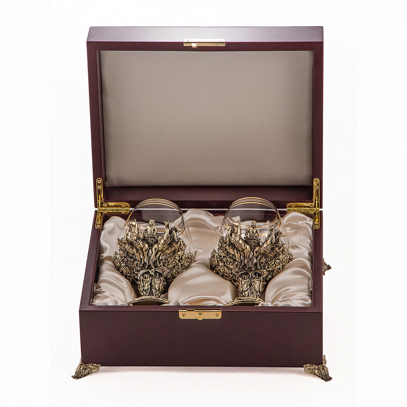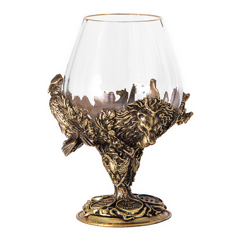 Сложное объемное литье из бронзы, в сочетании с декорированным богемским стеклом, делает эти бокалы не только презентабельными,