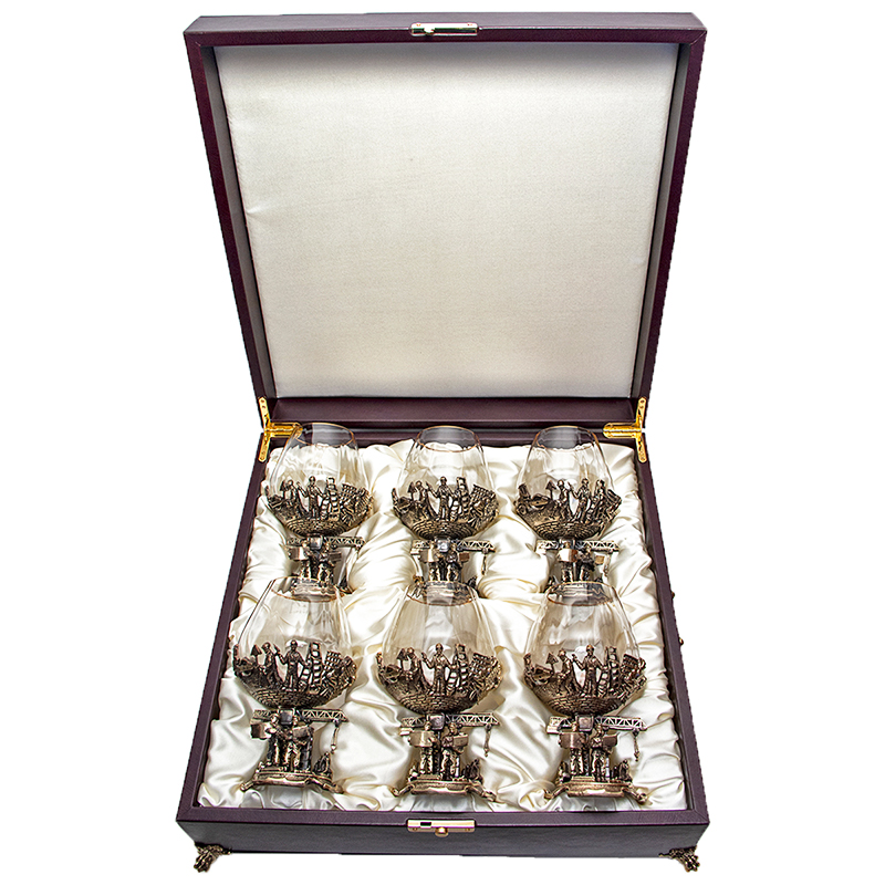 Сложное объемное литье из бронзы, в сочетании с декорированным богемским стеклом, делает эти бокалы не только презентабельными,