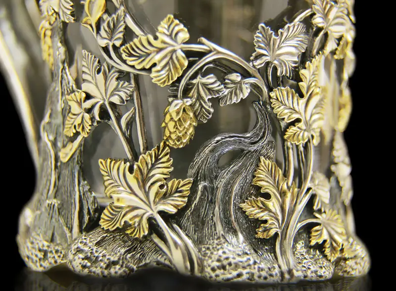 Искусная отделка позволила добиться наибольшего соответствия образу, подчеркнуть благородство, особенность и красоту каждой детали изделия. А легкое золочение, оживляя и украшая, придает кружке сказочный оттенок.
