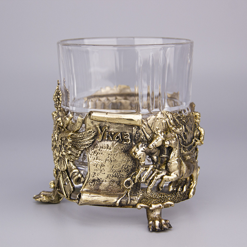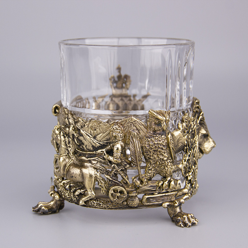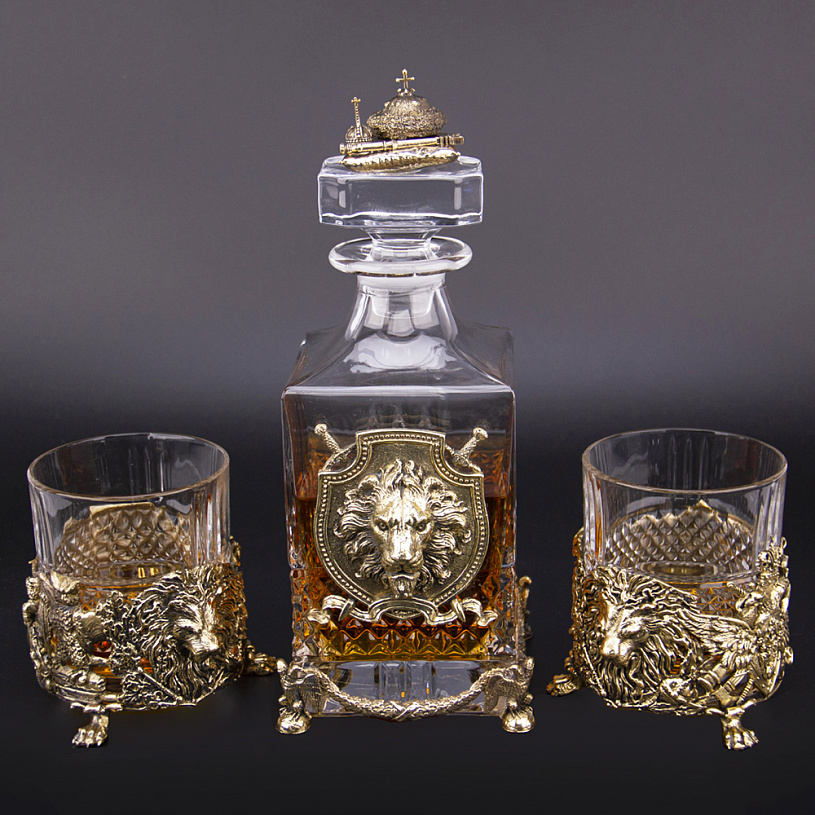 Декорация бронзой хрустального штофа венками победителя, ножками в виде орлов, объемным медальоном «Лев на щите» в стиле Фаберже и крышкой с регалиями царской власти, еще больше подчеркивает статусность подарка.