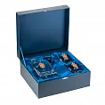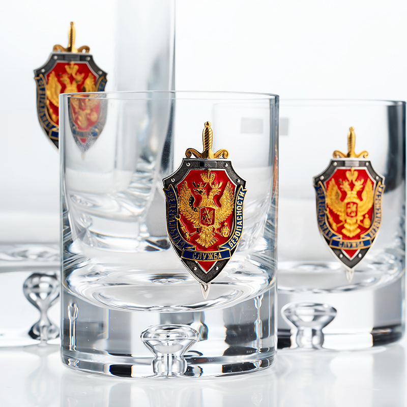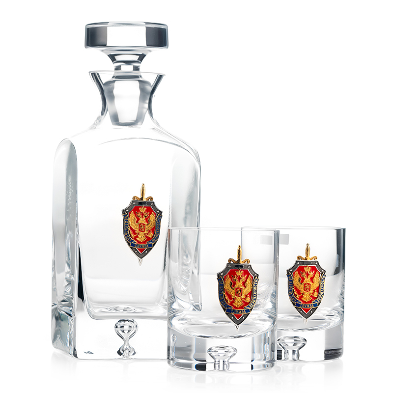 Набор для крепких напитков состоит из графина и 2 стаканов. Сосуды изготовлены из премиального стекла, и украшены серебром c эмалями. Сет упакован в подарочный футляр и транспортную коробку.