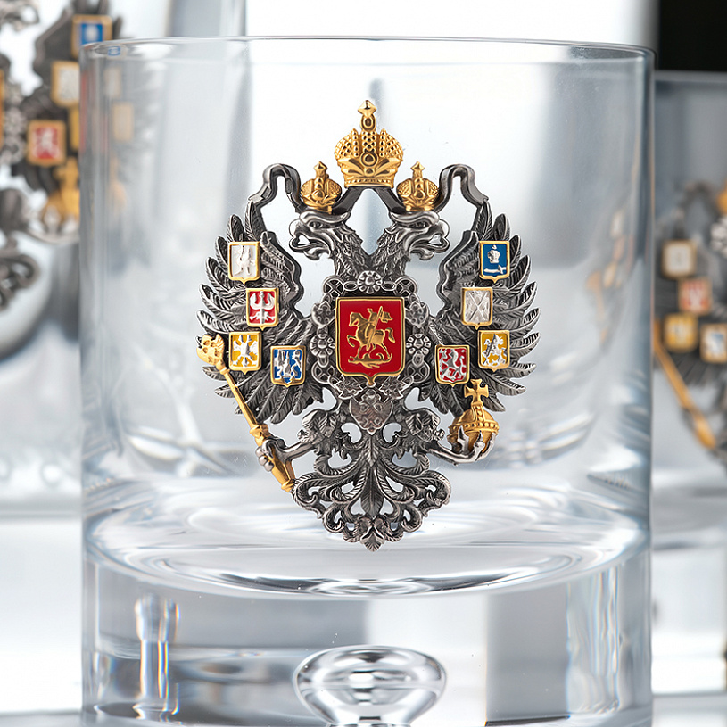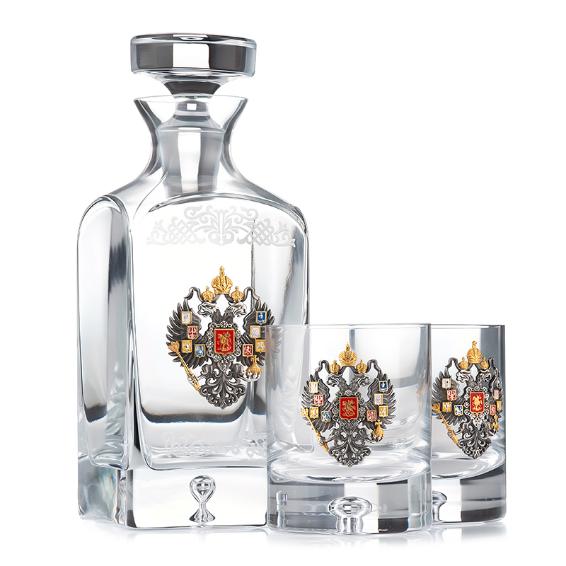 Набор для крепких напитков состоит из графина и 2 стаканов. Сосуды изготовлены из премиального стекла, и украшены серебром c эмалями. Сет упакован в подарочный футляр и транспортную коробку.